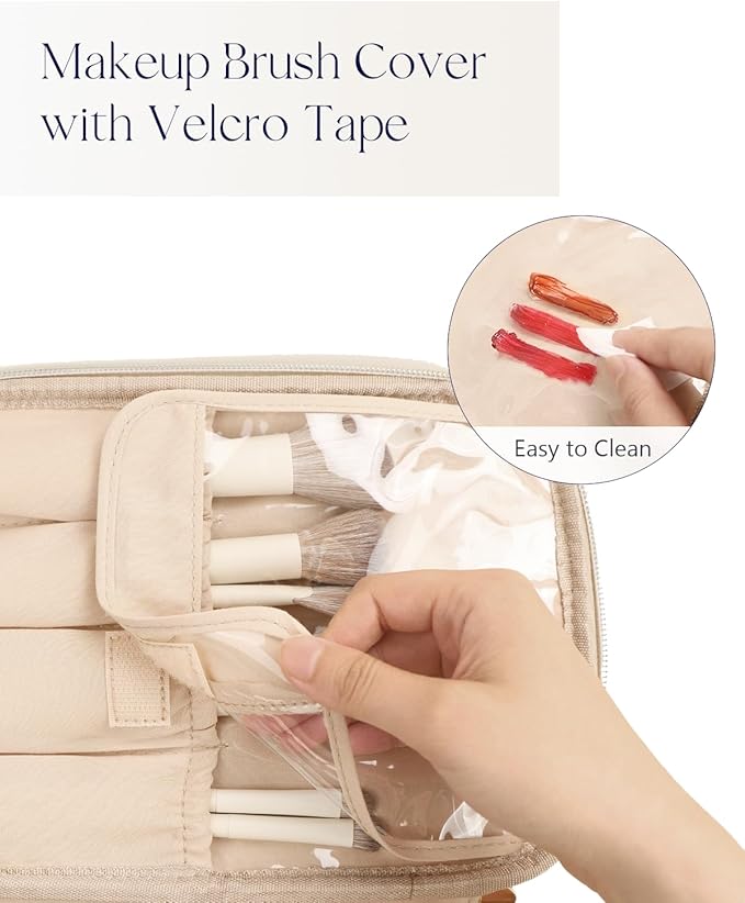 - 【SEPARATE BRUSHES COMPARTMENT】Featuring 4 slots with a transparent makeup brush cover equipped with Velcro tape, the top flap accommodates over ten brushes of varying sizes, while the transparent PVC cover ensures effortless cleaning and dust resistance