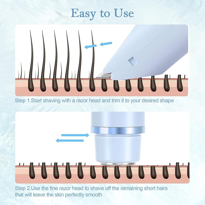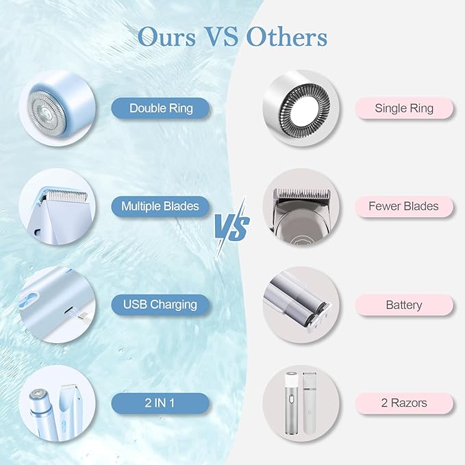 - 👙【2 in 1 Dual Head Bikini Trimmer】Our trimmer for women features a dual head design, with a shaving head at the top with fixed length comb teeth to help you control the length of your trim, and a fine shaving head at the bottom. You'll be able to maneuver delicate areas like underarms and legs with ease and get a smooth, precise shave every time