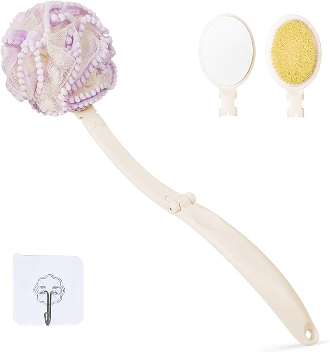 - 【3-IN-1 MULTIFUNCTIONAL DESIGN】Topfinder bath loofah set with 19" solid long handle and 3 interchangeable head. Includes loofah sponge, bath brush, and lotion applicator—switch heads for customized skincare & cleaning routines