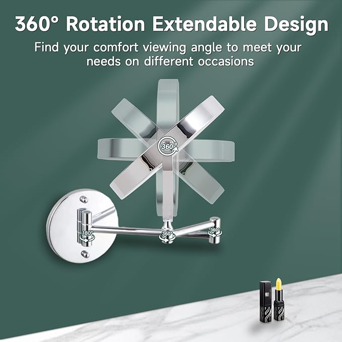 - đĄă360°Rotation & Extendable Armă:The lighted makeup mirror with magnification is mounted on the wall, designed with a extendable arm. 360 degree free rotation provides you with a comfortable viewing angle when putting on makeup, shaving or wearing contact lenses. It can be folded against the wall to save space when not in use