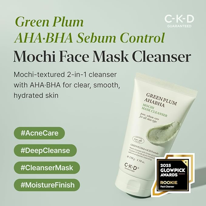 CKD Green Plum AHA·BHA Clay Mask Cleanser - All in One, Korean Face Wash + Makeup Remover + Gentle Scrub with Controls Sebum, Tightens Pores, Removes Blackheads. All Skin Types. 4.58 oz