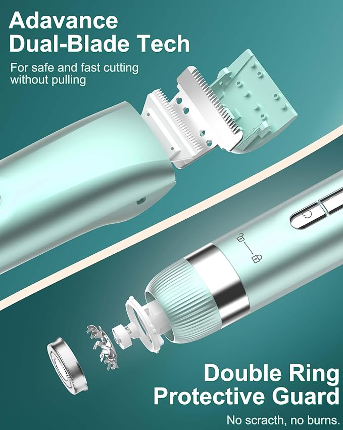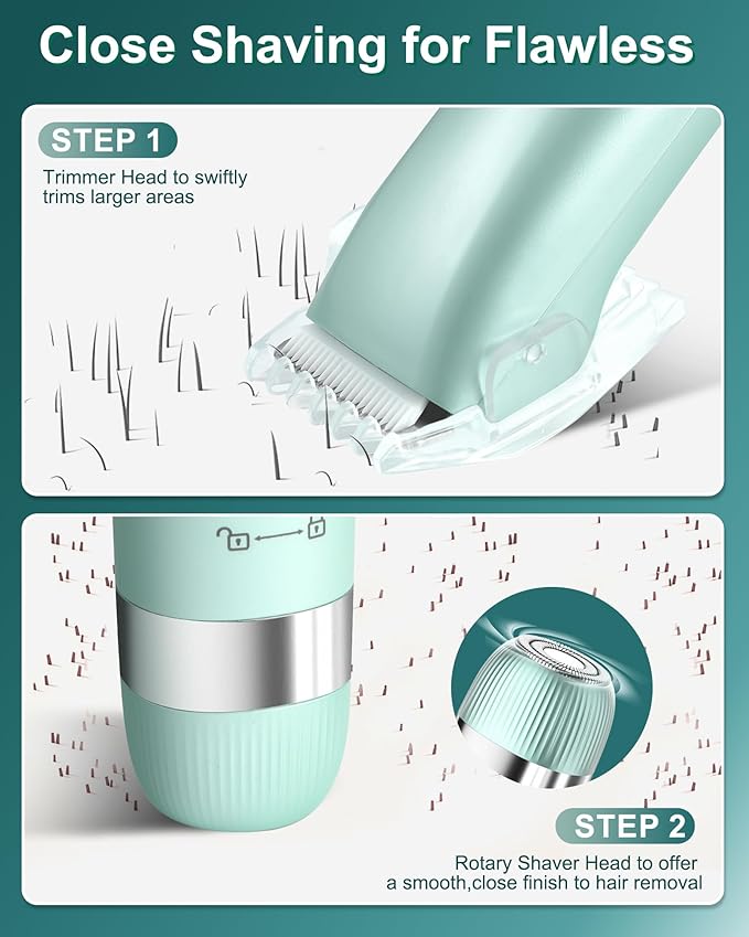 - 🔀 2-in-1 Dual Head Bikini Trimmer – This bikini trimmer for women offers a versatile trimmer for women with two specialized heads: a wider blade for efficient body grooming and a precision head for delicate areas like the face and bikini line. Perfect for achieving smooth skin on legs, underarms, upper lip, and more with one effortless tool