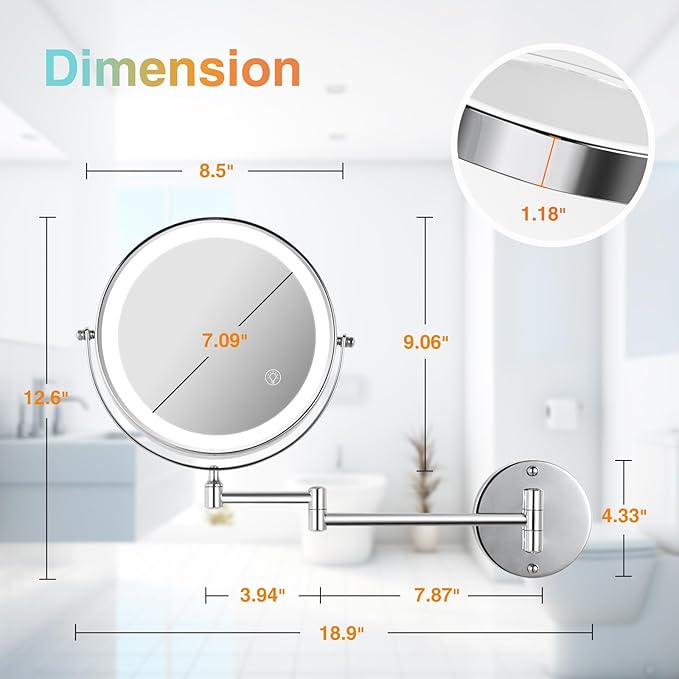 - 【Wall Mounting& Extendable Arm Makeup Mirror】Professional-grade chrome-finished mounting bracket extends and swivels for flexible positioning and easy adjustment. The flexible mirror arm can be freely extended so that the magnifying mirror can be adjusted to the right viewing angle and distance, allowing you to freely apply makeup, shaving or wearing contact lenses, etc. It can be folded against the wall to save space when not in use.