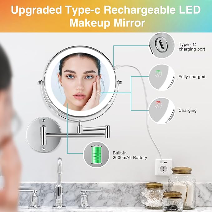 - 【Cordless and Rechargeable Mirror】This upgraded wall mounted makeup mirror built-in 2000mAh rechargeable Lithium battery, which can be used 30 minutes a day for 12 days on a single full charge, and the extra-long battery life allows you to not have to charge it frequently. Type-C cable is included. No placing batteries needed, no unsightly cords on your walls!