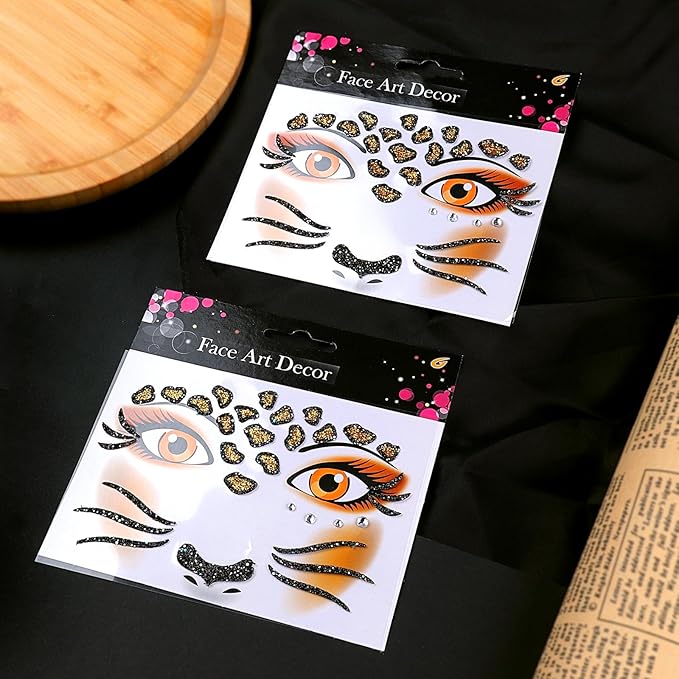 Face Stickers Gems Halloween Temporary Tattoo Sticker Animals Face Sticker Decal Body Face Self-adhesive Sticker Stage Makeup Party Cosplay Decoration 2pcs (cheetah)