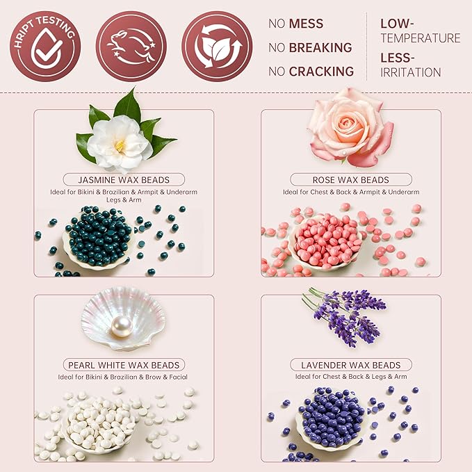 - Gentle on Skin, Tough on Hair: Enjoy a soothing waxing experience with Lifestance’s HRIPT-certified wax beads—crafted from premium natural ingredients like jasmine/rose/lavender/coconut extract, and so on. Perfect for sensitive skin! Our hair removal wax kit also includes pre & post wax treatment oil spray to pamper your skin. Say goodbye to irritation and hello to smooth, cared-for skin with every use