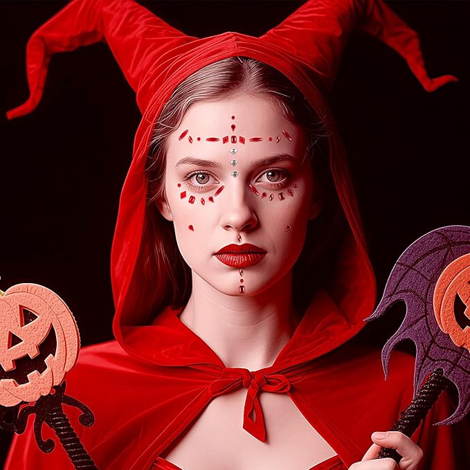 - Makeup Face Gems Self-Adhesive: Elevate your makeup game with our makeup face gems set. This set includes 2 sheets of red face rhinestones, along with precision tweezers, all crafted from high-quality, hypoallergenic materials. Gentle on the skin, these gems ensure a comfortable wearing experience for all ages and skin types, making them the perfect addition to your Halloween makeup arsenal