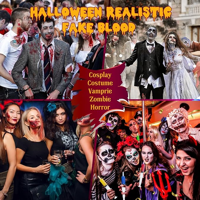 - Halloween Realistic Fake Blood Kit ZENTANMEI’s fake blood set includes 60ml spray for instant splatters, 60ml slow-drying dripping blood, and 31ml viscous gel—perfect for SFX makeup. Create authentic blood effects for Halloween, vampire looks, or zombie costumes with textures mimicking real blood’s shine and flow.