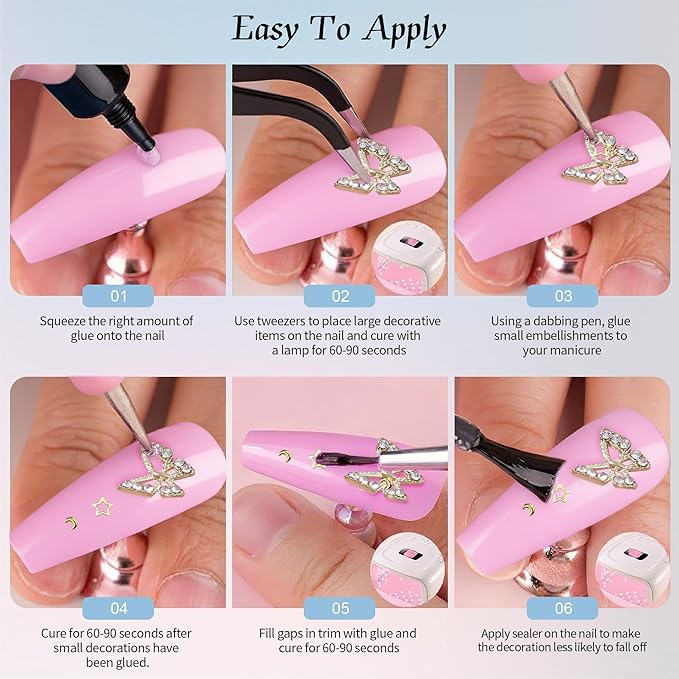 - How to use: Clean your nails, add a base coat, place the nail charms for nails