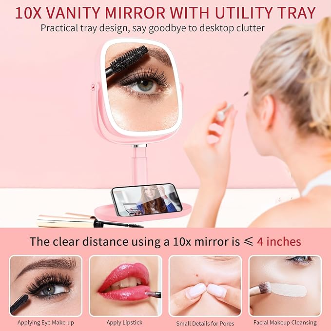 - 【8.5" Large 1x/10x Magnifying Mirror with Light】This makeup mirror with lights and magnification features double sided design, the 1x mirror is a HD personal makeup mirrors for daily using, clear and undistorted 10x mirror for detailed makeup, especially for poor eyesight (such as applying eye shadow, eyeliner, eyebrow trimming, wearing contact lenses and checking for fine lines,etc). Warm Tips: When using the 10x magnifying, stay within 4 inches to avoid dizziness