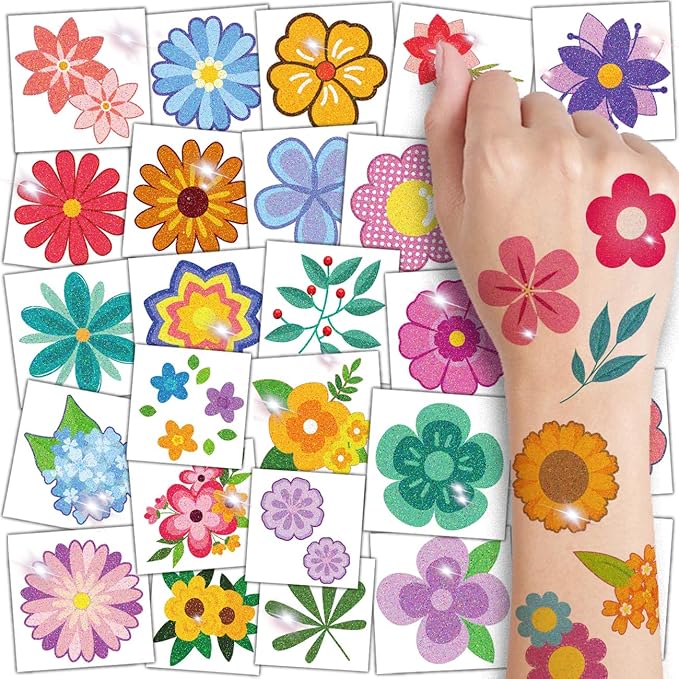 - ⚡Glow & Shimmer Effect:These awesome flower tattoos can be used in various occasions. Ideal for flower theme parties, birthdays, Halloween, Easter, or as summer beach accessories. Decorate skin, notebooks, water bottles! kids love showing off their sparkly tattoos at parties!