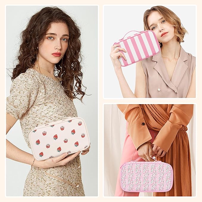 Relavel Makeup Bag, Small Makeup Bag for Women, Travel Cosmetic Bag, 2 Layers Waterproof Makeup Organizer Storage with Makeup Brush Holder, White Straberry