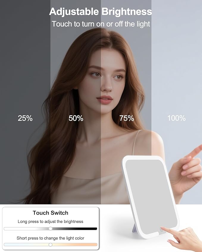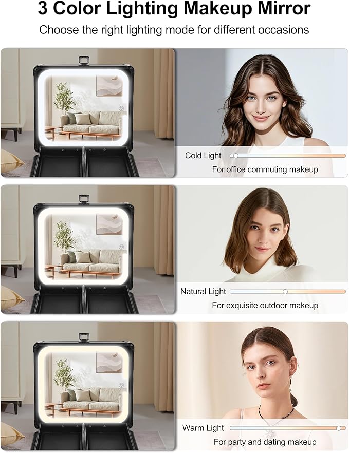 - Rechargeable 3 Lights LED Mirror: The built-in mirror offers three lighting modes (white, warm, and cool) with adjustable brightness. Powered by a 2000mAh rechargeable battery, it can be detached and used separately with its 360° rotating stand. Achieve flawless makeup under any lighting.