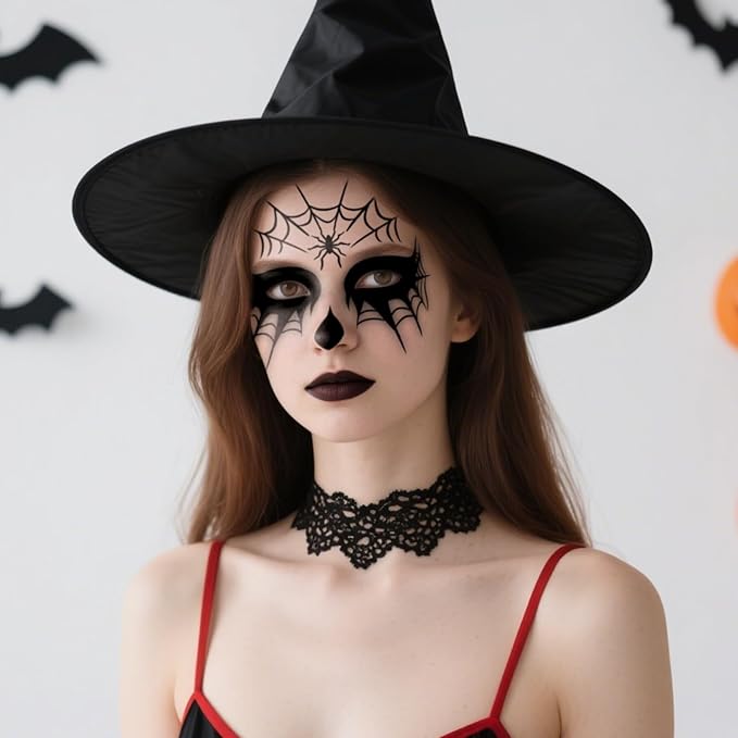 - 【Product Design】Our Halloween face tattoos have a unique and charming aesthetic. The main design element is a striking spiderweb pattern on the forehead with a striking spider in the center, perfectly capturing the essence of Halloween. The charming web pattern extends around the eyes, creating a whimsical yet elegant atmosphere. No need for fussy black makeup.