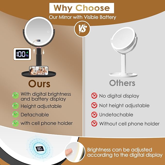 - Electric Display Light Brightness and Charging Power: There is a digital display screen on the mirror of the make-up mirror, press the touch button to light up the mirror, the digital display screen will show the percentage of battery power, it will be automatically turned off after five seconds without operation, you can charge the make up mirror in time according to the displayed power. Long-press the touch button to adjust the brightness. The digital display screen will show the percentage of brightness. You can adjust the brightness of the light according to the percentage displayed. Double-click the switch to turn off any colour light