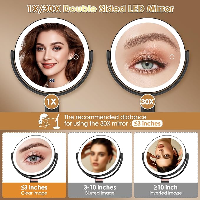 - 1X/30X Double Sided Magnifying Mirror: This LED Makeup Mirror has a double-sided design, the 1X mirror is suitable for checking your overall make-up, the 30X magnifying mirror can assist in a variety of fine make-up operations such as wearing contact lenses, cleaning facial hair, shaving, plucking eyebrows, applying mascara, it also comes with a tweezer that can help you remove blackheads. (Warm Tips: keep your face 2-3 inches away from the digital mirror when using the 30X magnifier to avoid dizziness)