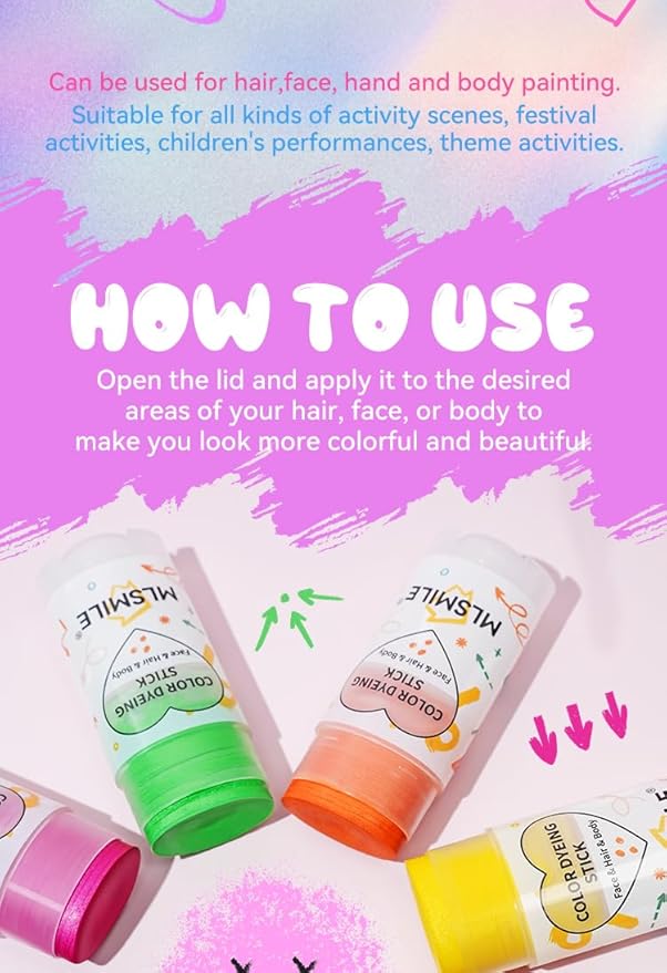 - Perfect Gift for Creative Expression - The pearlescent rainbow hair color dye stick makes a fun gift for artists, cosplayers, or anyone loving creative makeup. Whether for friends, lovers, or beauty enthusiasts, it’s a versatile tool to unleash imagination and dress up with confidence. Use our face hair body paint stick can create infinite beauty on the hair, face, hands, and other parts of the body.