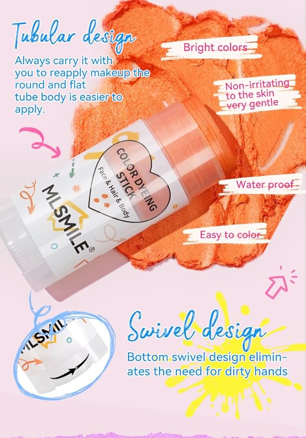 - Endless Festive & Cosplay Possibilities - Ideal for Christmas parties, campfire gatherings, carnivals, and Halloween cosplay, easy to carry and apply, this washable hair body face paint creates stunning effects for versatile makeup, artistic designs, or special effects stages. The ingredients of the pearlized hair color sticks are very mild and non irritating to the skin, safe for kids and adults to do hair, face and body painting. Stand out at any event with vibrant, smudge-proof colors.