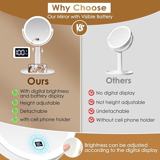 - Electric Display Light Brightness and Charging Power: There is a digital display screen on the mirror of the make-up mirror, press the touch button to light up the mirror, the digital display screen will show the percentage of battery power, it will be automatically turned off after five seconds without operation, you can charge the make up mirror in time according to the displayed power. Long-press the touch button to adjust the brightness. The digital display screen will show the percentage of brightness. You can adjust the brightness of the light according to the percentage displayed. Double-click the switch to turn off any colour light
