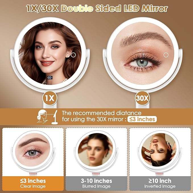 - 1X/30X Double Sided Magnifying Mirror: This LED Makeup Mirror has a double-sided design, the 1X mirror is suitable for checking your overall make-up, the 30X magnifying mirror can assist in a variety of fine make-up operations such as wearing contact lenses, cleaning facial hair, shaving, plucking eyebrows, applying mascara, it also comes with a tweezer that can help you remove blackheads. (Warm Tips: keep your face 2-3 inches away from the digital mirror when using the 30X magnifier to avoid dizziness)