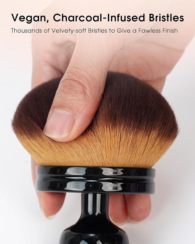 - CONCIOUSLY CREATED! Extra large Kabuki brush handcrafted with love, each piece boasts the exquisite touch of velvety material, densely-packed charcoal-infused vegan bristles evenly disperse beauty product for self tanner, hugging every curve for flawless body coverage for legs make up, arms, back and décolleté! With a comfortable handle ensures easy accessibility to even the hardest-to-reach places.
