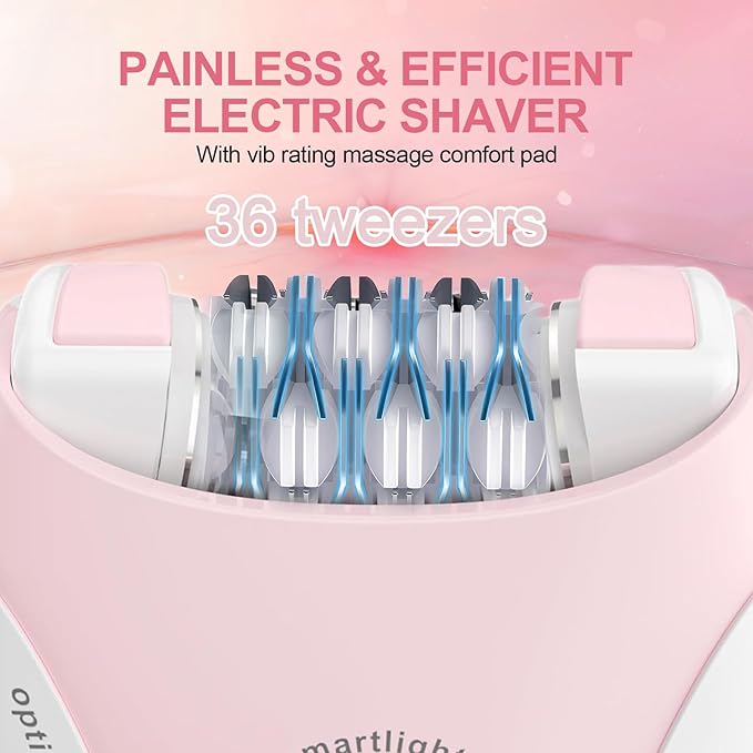 - đ¸ăEfficient and Painless EpilatorăOur facial hair remover for women is equipped with 36 high-precision hypoallergenic tweezers that accurately grab fine and coarse hairs, and uproot even the shortest hairs, and the vibrating massage pads on both sides synchronize to soothe the skin and reduce the feeling of pain, making epilating easier and more comfortable