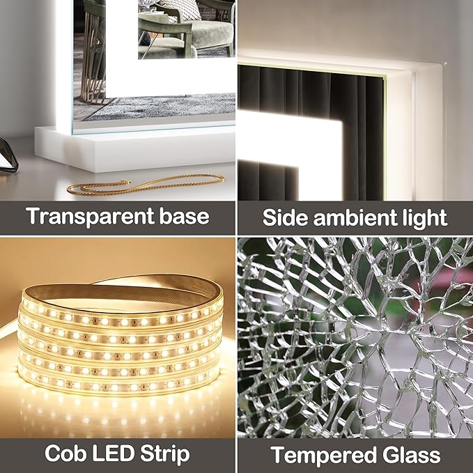 - 👍【Unique Side Lighting Design, Upgraded Atmosphere】Compared to ordinary mirrors, our vanity mirror ingeniously adds a side lighting function. The front and side lights complement each other, not only providing you with more even and shadow-free lighting but also creating a warm and bright overall vanity atmosphere, making you feel as if you were in a professional makeup room and fully enjoy the fun and beauty of makeup.
