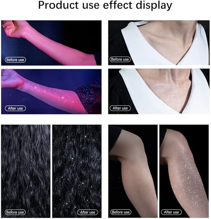 - Glitter makeup spray creates perfect shimmer for face, hair and body, and makes you glow like a goddess.