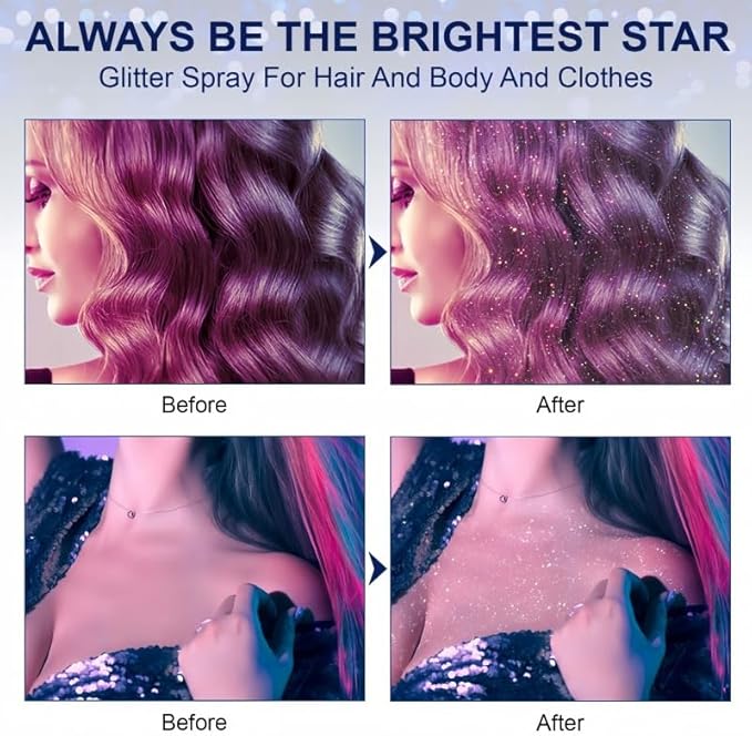 - Glitter spray is the perfect addition for body glitter adornment, ideal for festivals, clubs, parties, raves, outfits, adding glitter and charm to your face, body and hair.