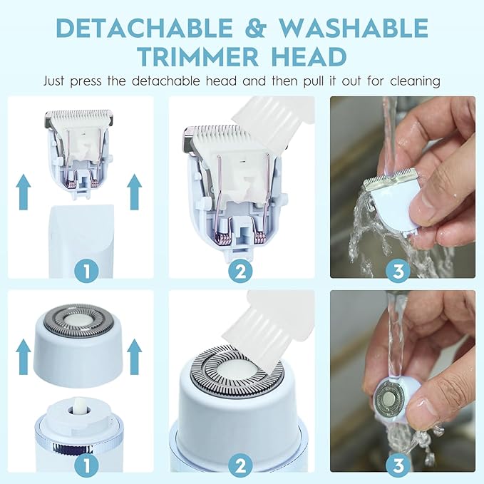 - 2-in-1 Dual Head Shaver Women: Nawedaa pubic hair trimmer women features an innovative dual head design that combines the functions of a facial and body shaver in one. There is no need to change the cutter head. One head is a body shaver, perfect for arms, legs, bikini areas, or other body parts, while the other is a facial shaver head used to remove hairs on the cheeks, chins, and upper lips. (precision rotary blade handles fine hairs and fuzz.)
