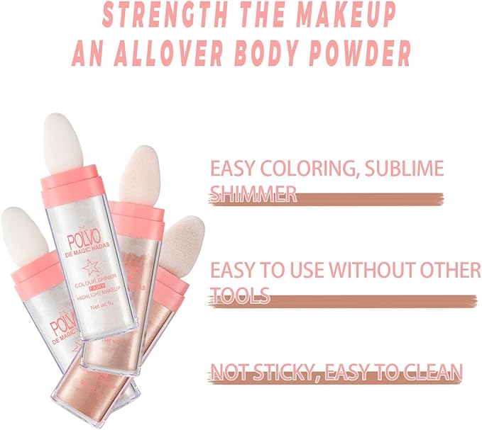 - 【Lightweight & Non Sticky】Feather-like non-flying powder provided satin finish on skin. Weightless, long-wear, diamond-dusted highlighter for the face and body in a range of shades, from subtle to supercharged. The superfine formula goes on smoothly and evenly, fresh and buildable delivers major chromatic impact. Soft sponge head, easy to apply and remove.