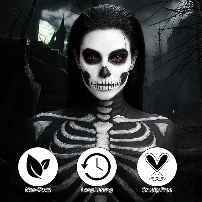 - 🖤💀Vegan and Cruelty free: Our goth black white face body paint is made with skin-loving ingredients, not tested on animals and suit for all ages, including seniors and teens, adults and kids. The halloween mime face paint is suit for all skin types, even sensitive skin!