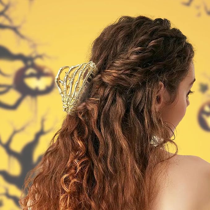 3 Pcs Halloween Hair Claw Clips Black and Golden Skeleton Hand Hair Styling Accessories for Women Girls, Gothic Large Medium Size Catch Clips for Thick Hair Horror Theme Party