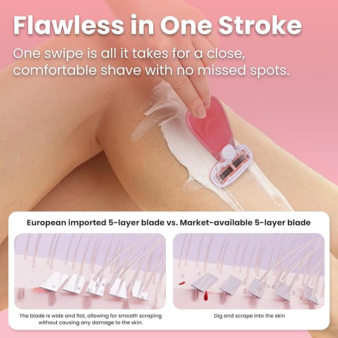 - 【Extra Smooth 5-Blade Shave】Experience an extra smooth, salon-quality shave with 5 premium blades. This 5-blade razor glides effortlessly to remove hair at the root without tugging or irritation, leaving your skin incredibly soft and flawless. The optimized coating technology prevents hair from getting stuck, ensuring a clean shave every time.