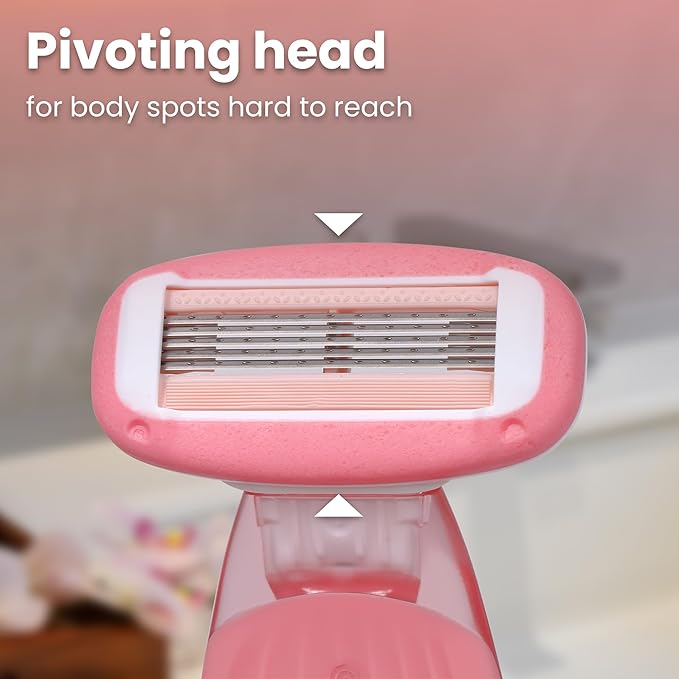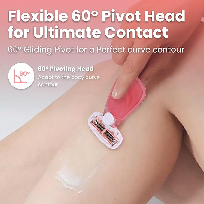 - 【Pivoting Head for Curves & Bikini Line】The 60° pivoting head effortlessly adapts to your body's every curve, from ankles and knees to the delicate bikini line. This skin adaptive design guarantees total contact with your skin, eliminating nicks, cuts, and missed hairs for a perfectly smooth and safe shave.