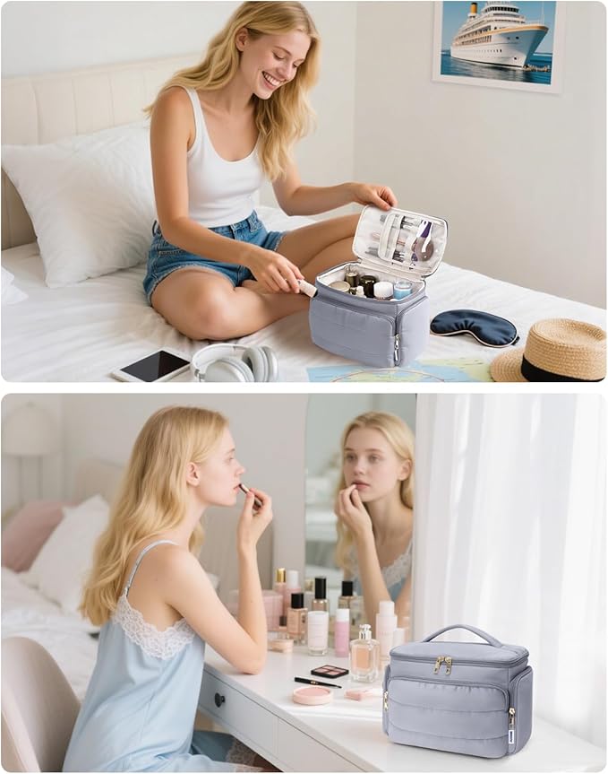 - 【Structured and Soft】Crafted from durable, water-resistant quilted fabric, this makeup bag organizer stands upright, resists spills, and keeps its shape—even when fully packed.