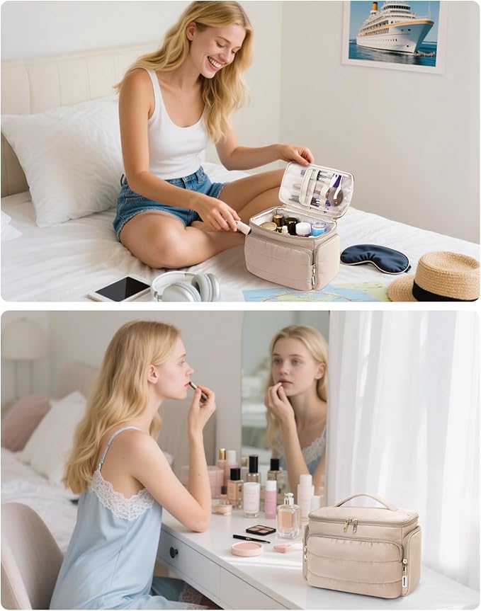 - 【Structured and Soft】Crafted from durable, water-resistant quilted fabric, this makeup bag organizer stands upright, resists spills, and keeps its shape—even when fully packed.