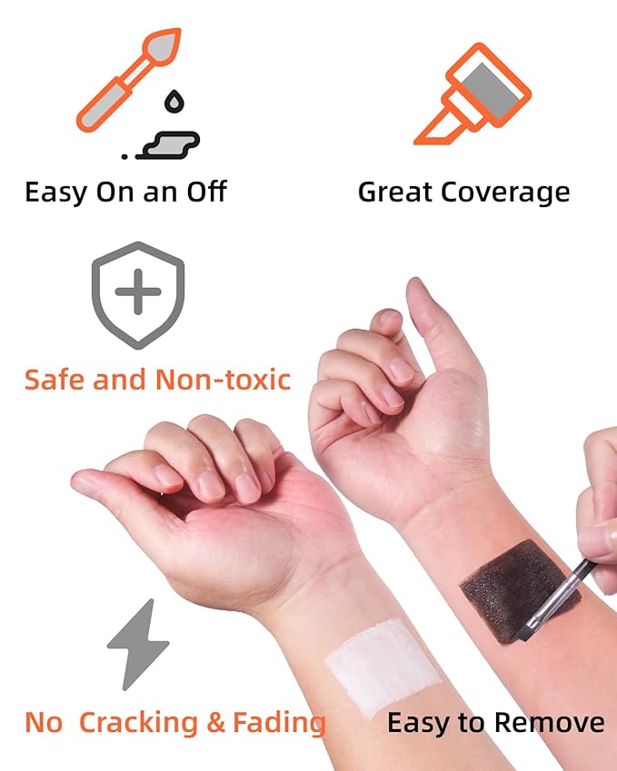 - Water-Based & Skin-Friendly: The face paints are water-based, quick-drying, and easily layerable for customized looks. They are also easy to wash off, gentle on the skin, and low in sensitivity, making them suitable for all skin types