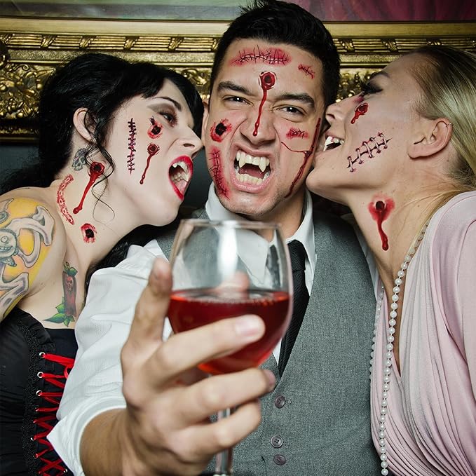 - Zombie Makeup Kit: These scars tattoos, indentations stickers, fake blood holes, and stitches are very realistic, just like real wounds, with a strong bloody effect.