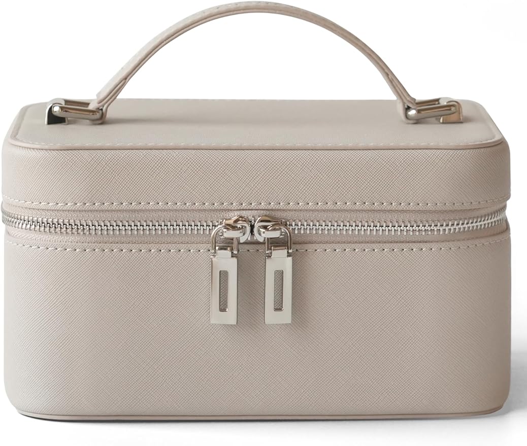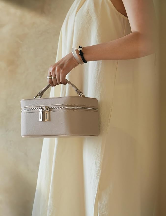 - [Premium Materials] – Crafted entirely from high-quality Saffiano leather, both the interior and exterior of the makeup case ensure exceptional durability and easy maintenance. The sturdy handle and silver hardware add a sophisticated touch, while the rotatable mirror lid allows for effortless angle adjustments, ensuring you always have the best view.