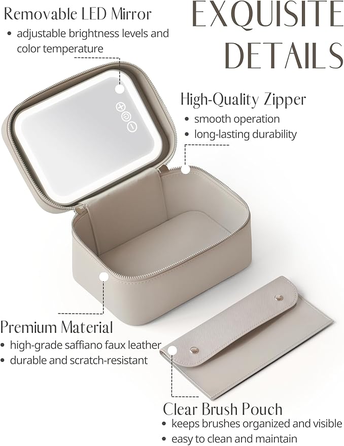 - [Travel-Friendly Makeup Bag Set] – This chic set includes a compact leather cosmetic case, an LED mirror, and a clear brush bag. The vanity case measures 8.5*5.7*4.5 inches, designed for effortless organization on the go, efficiently keeping your cosmetics stylishly arranged.