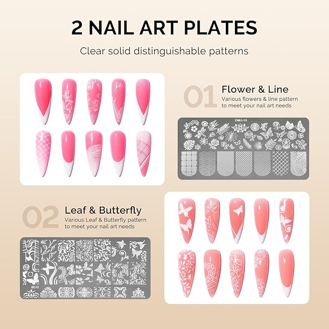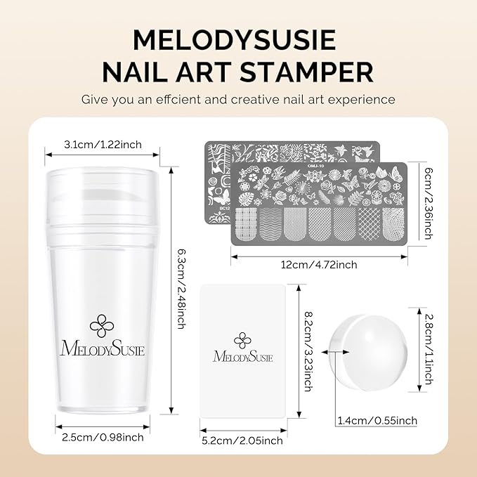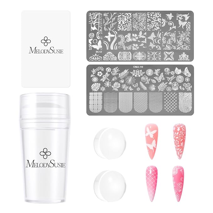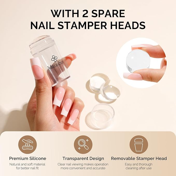 MelodySusie Nail Stamper Kit, Silicone French Tip Stamp Tool, 1PC Stamper, 1PC Scraper, 2PCS Stamping Plates, 2PCS Silicone Replaceable Heads for DIY Home French Manicure & Salon Art, Transparent