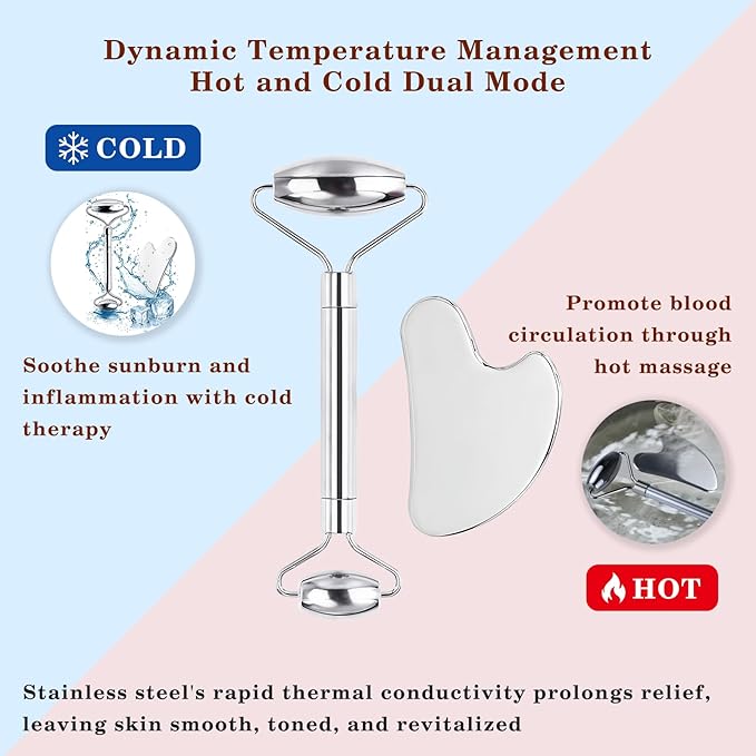 - ✅【Premium Durability】Gua sha tool for face made with stainless steel that boasts rapid thermal conductivity, Gua sha and face roller quickly adapts to both cooling and warming applications. The metal’s efficient heat transfer properties allow tools to maintain relax temperatures longer than traditional stone tools, delivering intensified relief.
