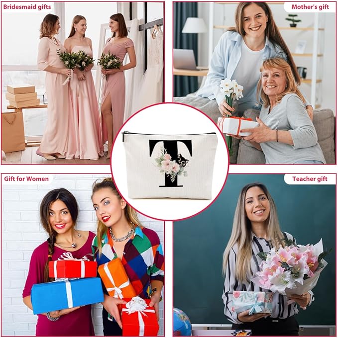 Floral Cat Initial Makeup Bag, Personalized Skin Care Bag, Travel Organizer Toiletry Bags for Women Mom Friends, Cosmetic Bags Makeup Pouch with Zipper, Letter T