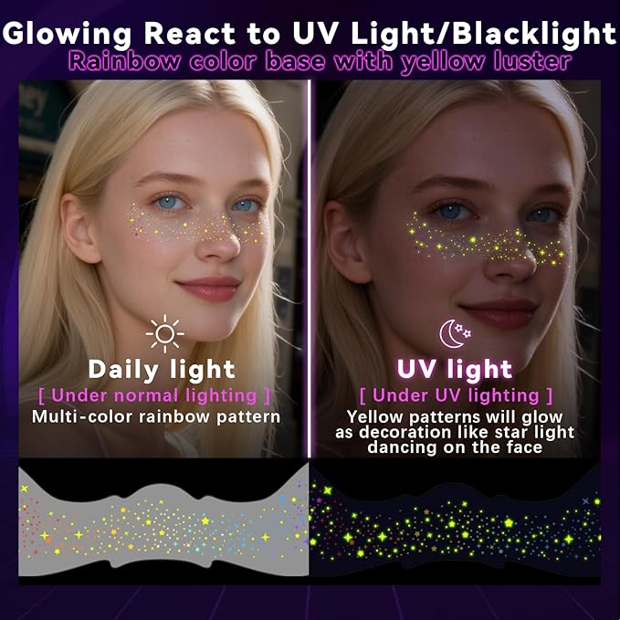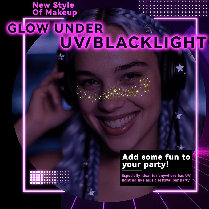 - For Many Occasions: Glow party decorations brighten up your makeup within moment! It is suitable for many place like bar, club, music festival, singer concert, rave party, etc., anywhere with UV light sources, the glowing effect will let you look so cool. The rainbow color and star pattern looks cute under normal light as well, wear it to wedding, birthday, parade or as decoration for Christmas, Halloween, New Year will be a good choice, too! Just have fun with your families and friends!