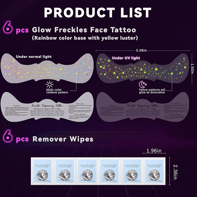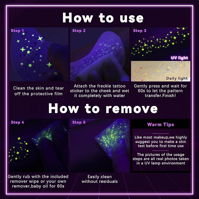 - Easy to Use: Put the tattoo sticker on the cheek and wet it completely with water or wet tissue, press for a while and peel it off, a multichrome freckle makeup is finished. Under normal light, it shows a normal multi-color. When you go to party, bar, anywhere has UV lighting, it shows a shinning glow. Wiping the included remover cotton, baby oil or your own remover can clean it off, never worry about residual