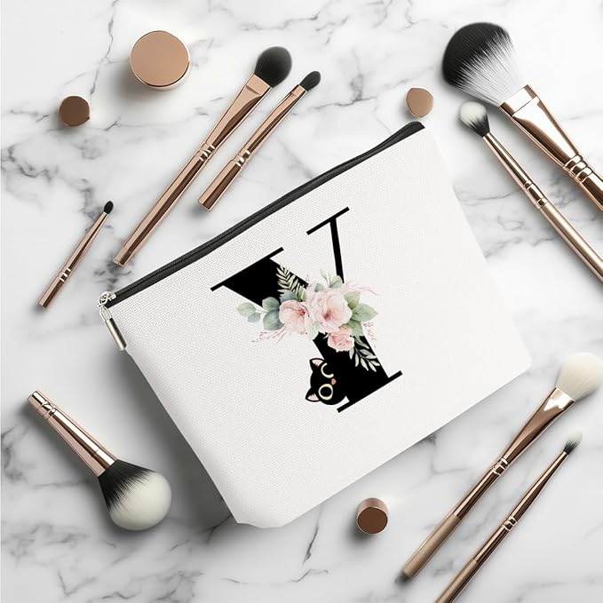 Floral Cat Initial Makeup Bag, Personalized Skin Care Bag, Travel Organizer Toiletry Bags for Women Mom Friends, Cosmetic Bags Makeup Pouch with Zipper, Letter Y