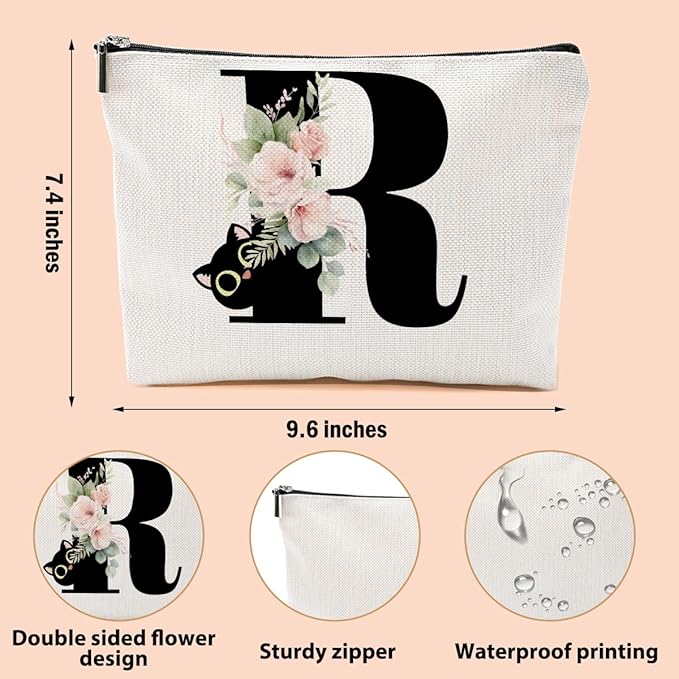 Floral Cat Initial Makeup Bag, Personalized Skin Care Bag, Travel Organizer Toiletry Bags for Women Mom Friends, Cosmetic Bags Makeup Pouch with Zipper, Letter R