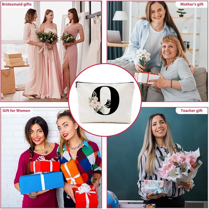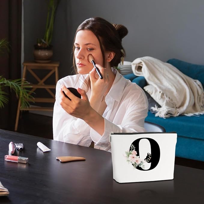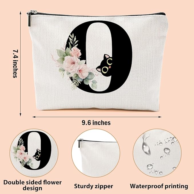 Floral Cat Initial Makeup Bag, Personalized Skin Care Bag, Travel Organizer Toiletry Bags for Women Mom Friends, Cosmetic Bags Makeup Pouch with Zipper, Letter O