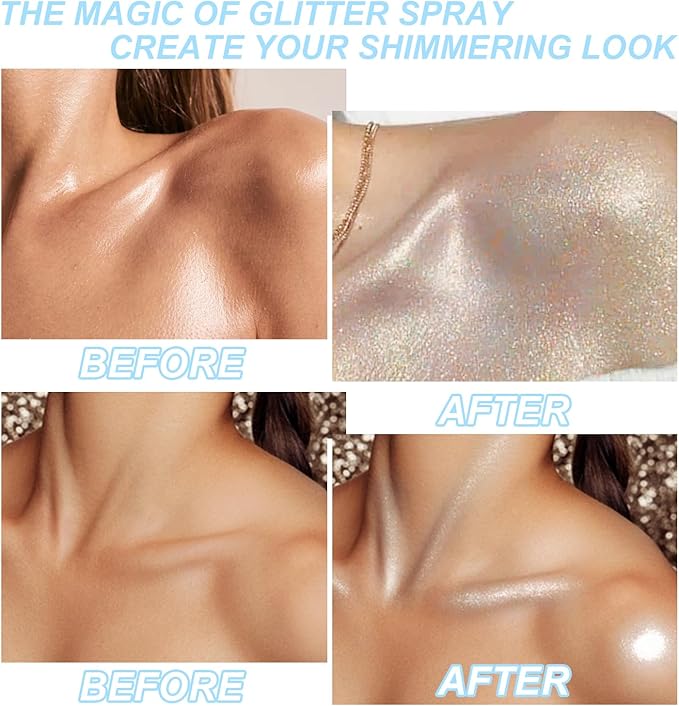 - 【Shimmering Highlighter Powder Spray】The highlighter powder spray combines multiple glitter particle for a multi-dimensional, diamond-like sparkle.